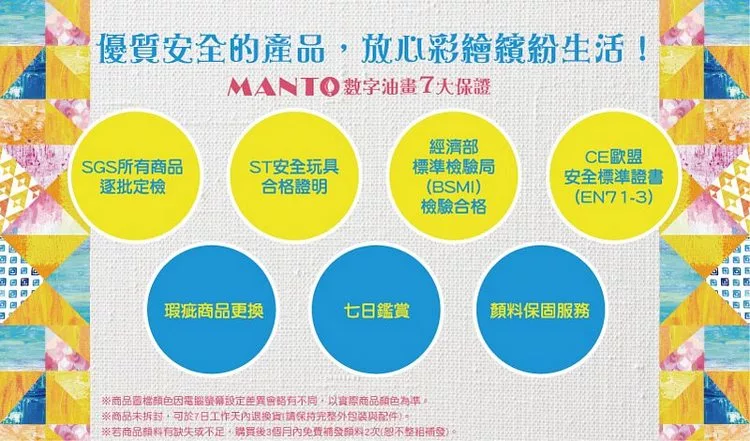 | 標準配備 | 畫筆x3、壁掛釘組x1、顏料組合x1(每款顏色組合均不同)、布畫板x1。 |