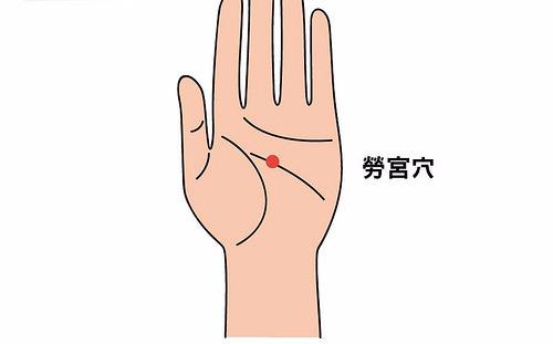 勞宮穴大致上位於手掌的正中央,用大拇指按壓它可以鎮定情緒及不安,能有效舒緩暈車所帶來的不舒服。
